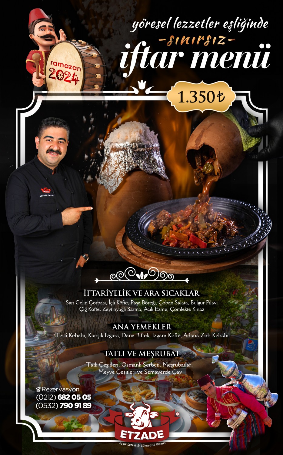 Anadolu Mutfağının en lezzetli ana yemeklerinden olan testi kebabı, tuzda kuzu, geleneksel tatlı çeşitleri, Osmanlı şerbetleri, semaver çayından oluşan zengin iftar menüsüyle Etzade Anadolu Lezzetleri, ramazan boyunca sizi bekliyor.